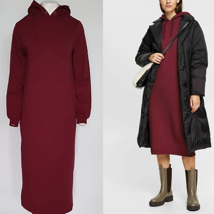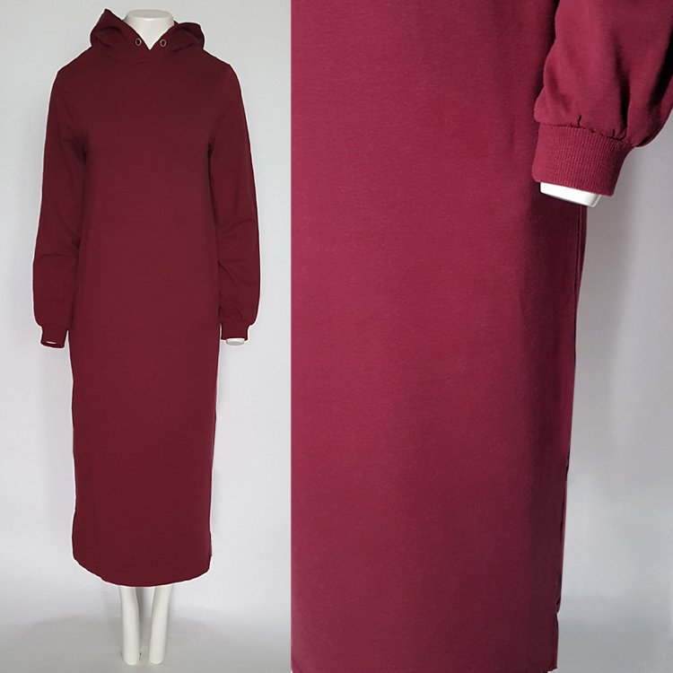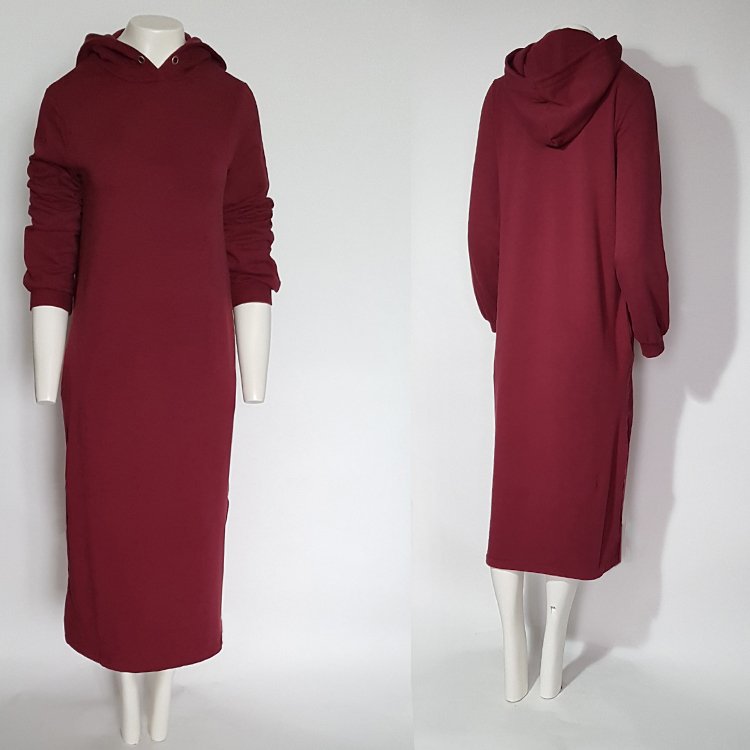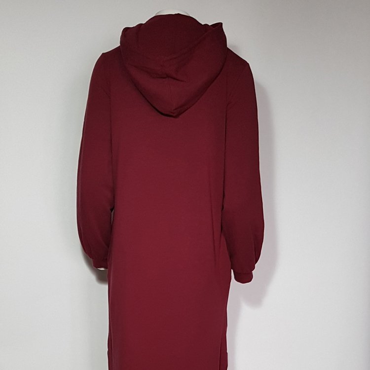 Sukienka z elastycznej, ciepłej dzianiny z meszkiem w kolorze burgund. Krój prosty, góra wykończona kapturem, z możliwością ściągnięcia sznurkami (sznurki nie wciągnięte do zdjęć, ale są w zestawie). Rękawy długie zakończone ściągaczem. Na wysokości bioder kieszenie w szwach bocznych.