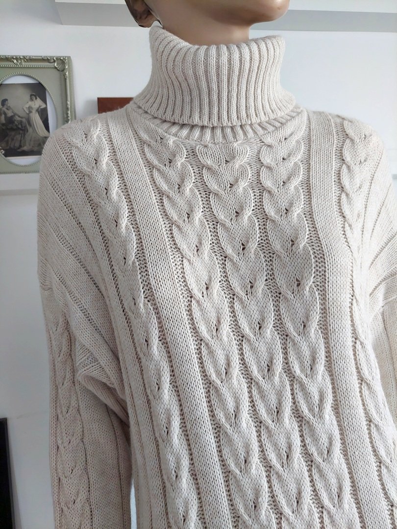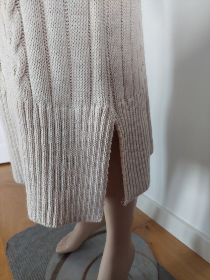 ciepła, długa sukienka z golfem. rękaw obniżony, na dole rozcięcia. materiał miękki niedrapiący, akryl poliamid i wełna rozmiar z metki brak,proszę sprawdzić wymiary. na manekinie małe 38,