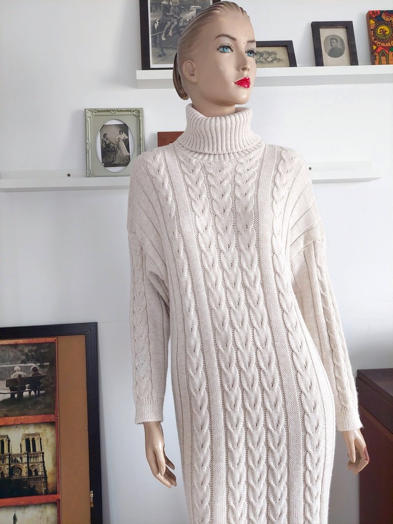 ciepła, długa sukienka z golfem. rękaw obniżony, na dole rozcięcia. materiał miękki niedrapiący, akryl poliamid i wełna rozmiar z metki brak,proszę sprawdzić wymiary. na manekinie małe 38,
