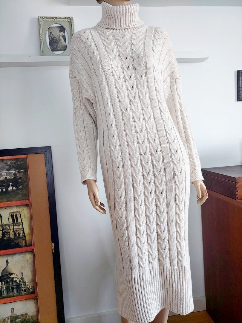 ciepła, długa sukienka z golfem. rękaw obniżony, na dole rozcięcia. materiał miękki niedrapiący, akryl poliamid i wełna rozmiar z metki brak,proszę sprawdzić wymiary. na manekinie małe 38,