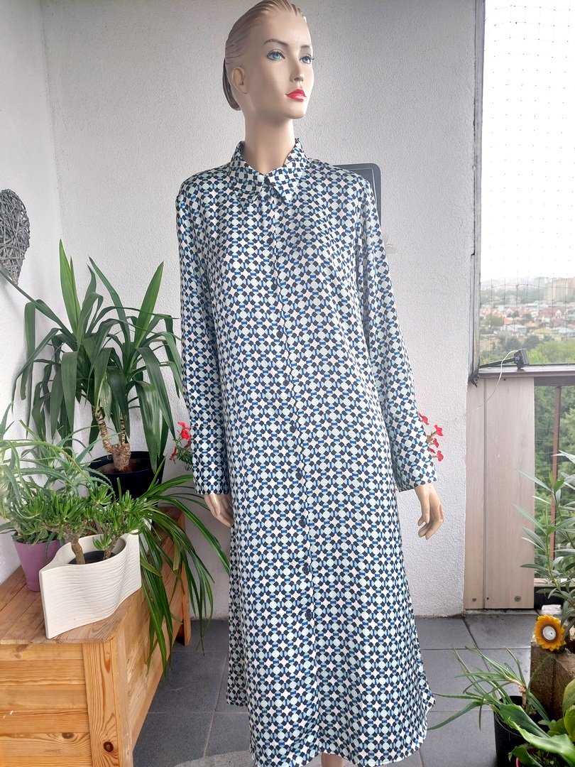 długa, rozpinana sukienka marki H&M. materiał atłasowy 100% poliester. rozmiar z metki M, proszę sprawdzić wymiary. na manekinie małe 38, bez podszewki. kolory niebieski, biały czarny.
