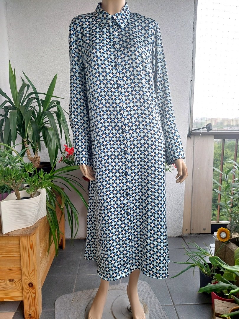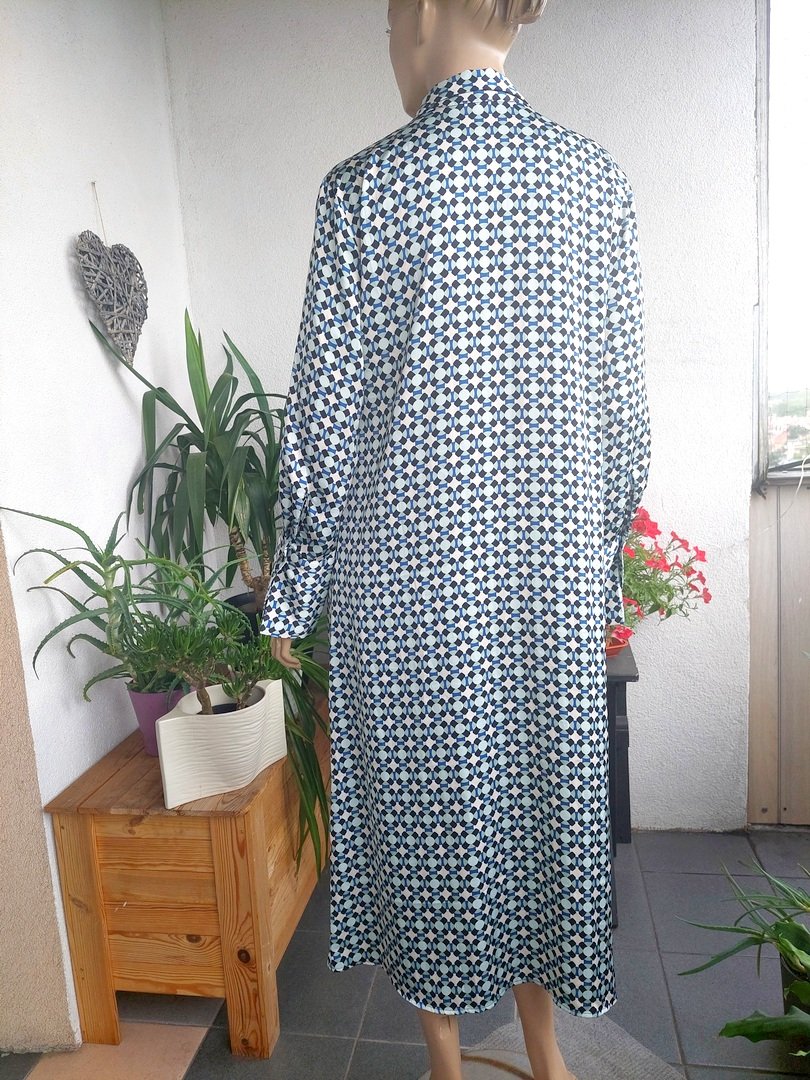 długa, rozpinana sukienka marki H&M. materiał atłasowy 100% poliester. rozmiar z metki M, proszę sprawdzić wymiary. na manekinie małe 38, bez podszewki. kolory niebieski, biały czarny.