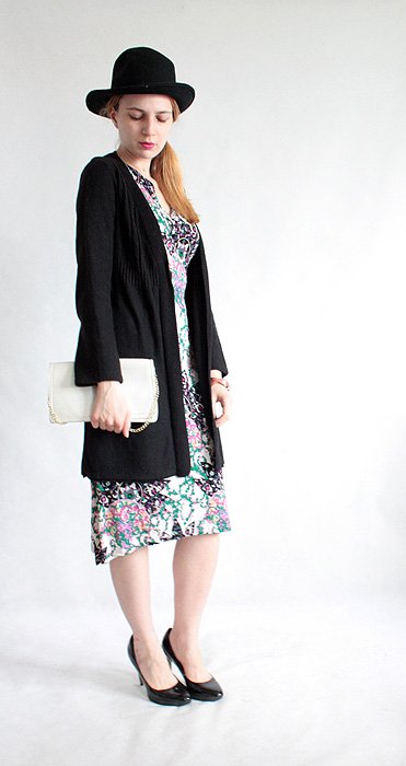 Uniwersalny, długi kardigan zapinany na jeden duży zatrzask.