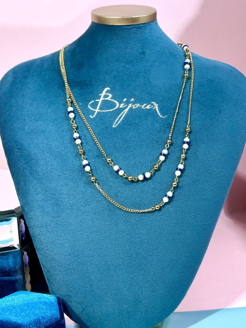 Łańcuszek o splocie pancerki, z segmentami z perełek i kobaltowych krążków.