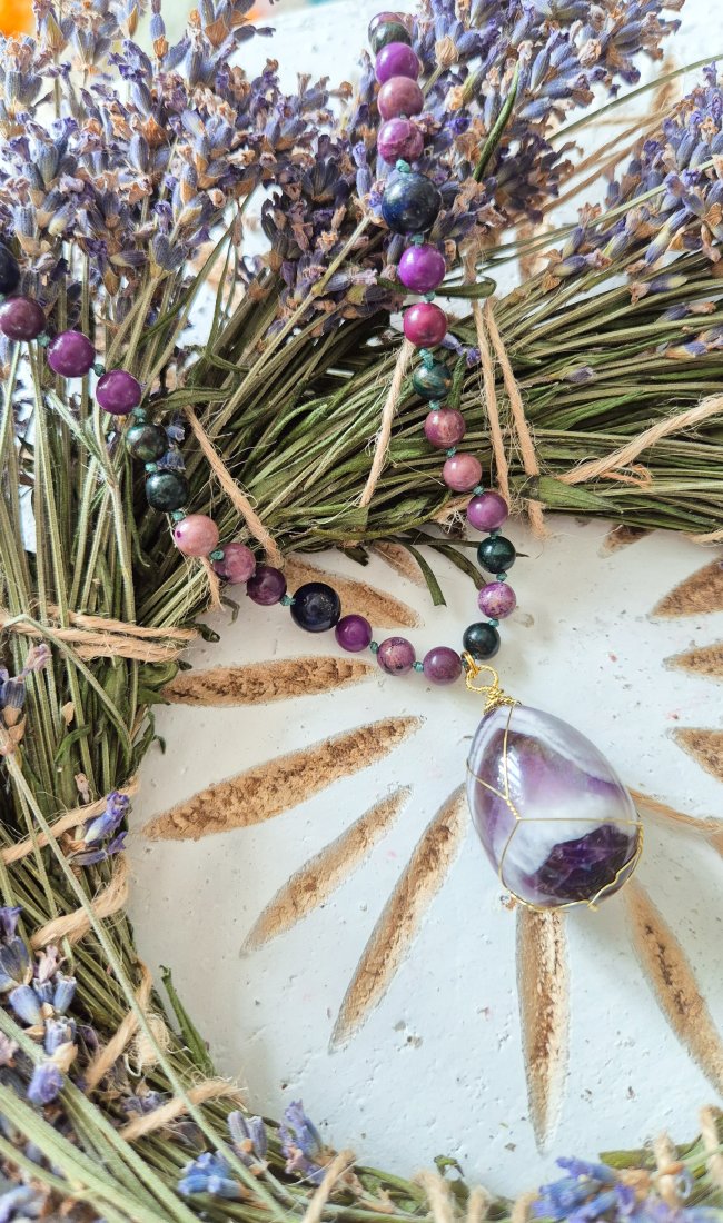 Całość dopełnia zawieszka z ametystu, który symbolizuje spokój, intuicję i wewnętrzną równowagę. ????