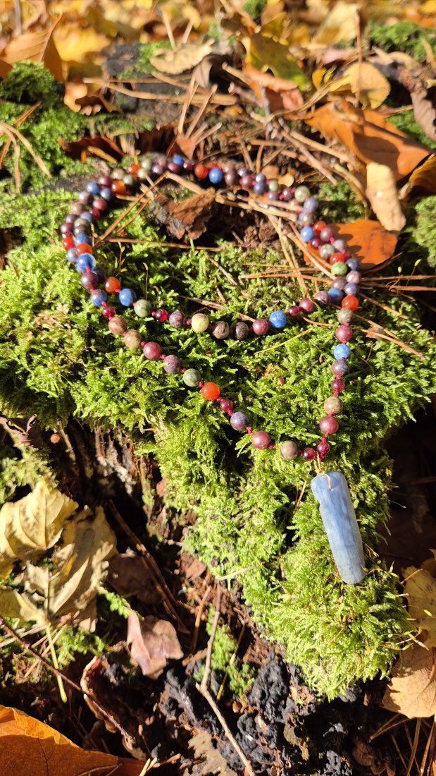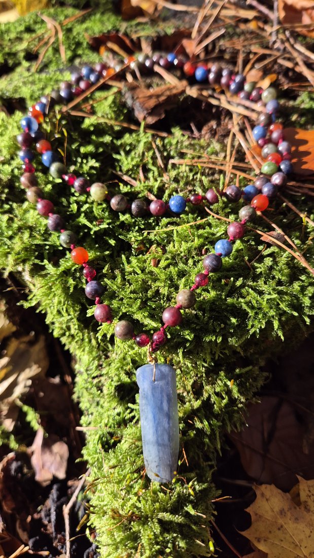 Wyjątkowy, ręcznie wykonany naszyjnik o niepowtarzalnym charakterze. Połączenie matowego granatu, energetycznego karneolu oraz harmonijnych odcieni zielonego i niebieskiego jaspisu tworzy biżuterię o silnej, lecz zrównoważonej energii. Całość dopełnia zawieszka z kianitu, która dodaje kompozycji subtelnego, duchowego blasku.