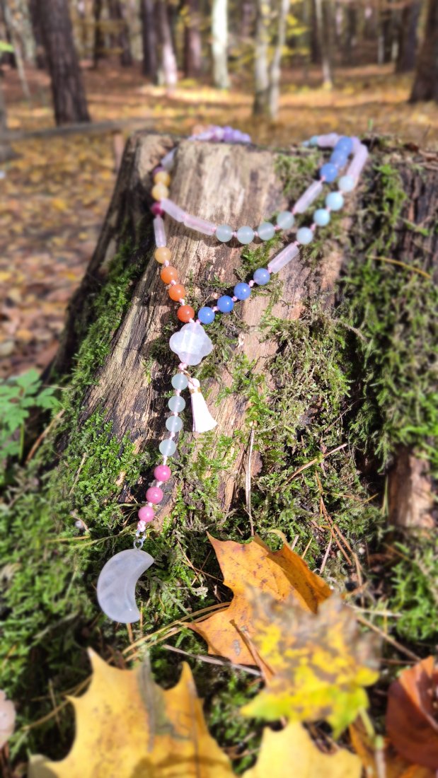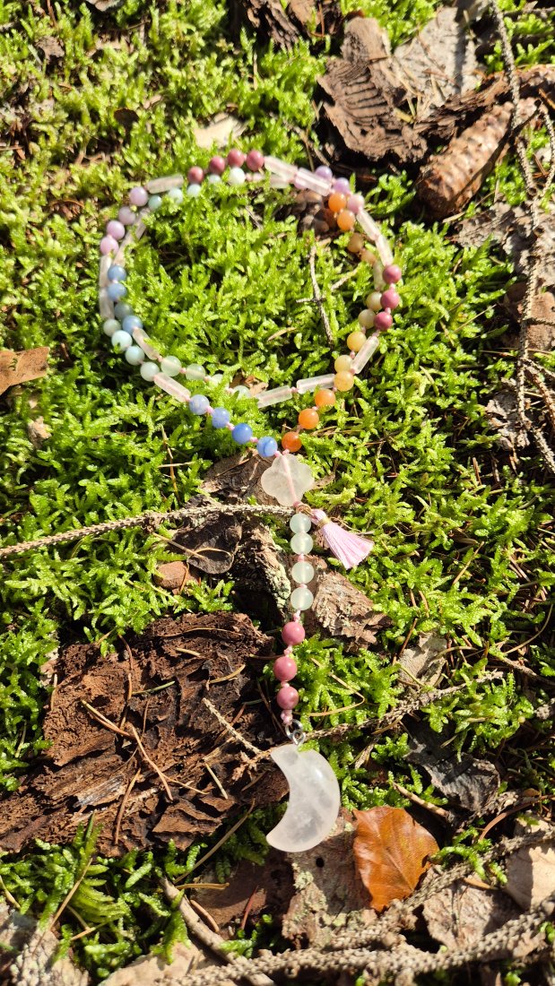 Delikatny i kobiecy naszyjnik stworzony z kamieni o łagodnych, pastelowych odcieniach, niosących energię spokoju, miłości i równowagi. Zawieszka w formie półksiężyca symbolizuje kobiecą intuicję, cykliczność i odrodzenie, a kwarc różowy potęguje wibracje miłości i harmonii.