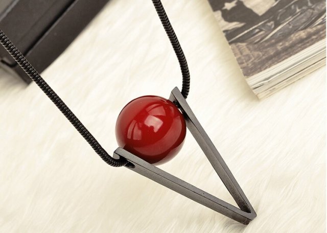 Niezwykle efektowny długi naszyjnik z dużą czerwoną kulą.
