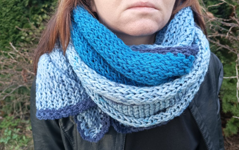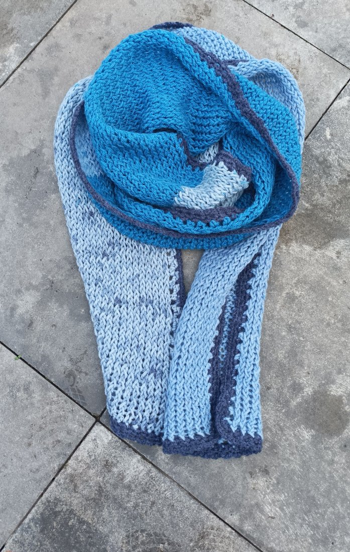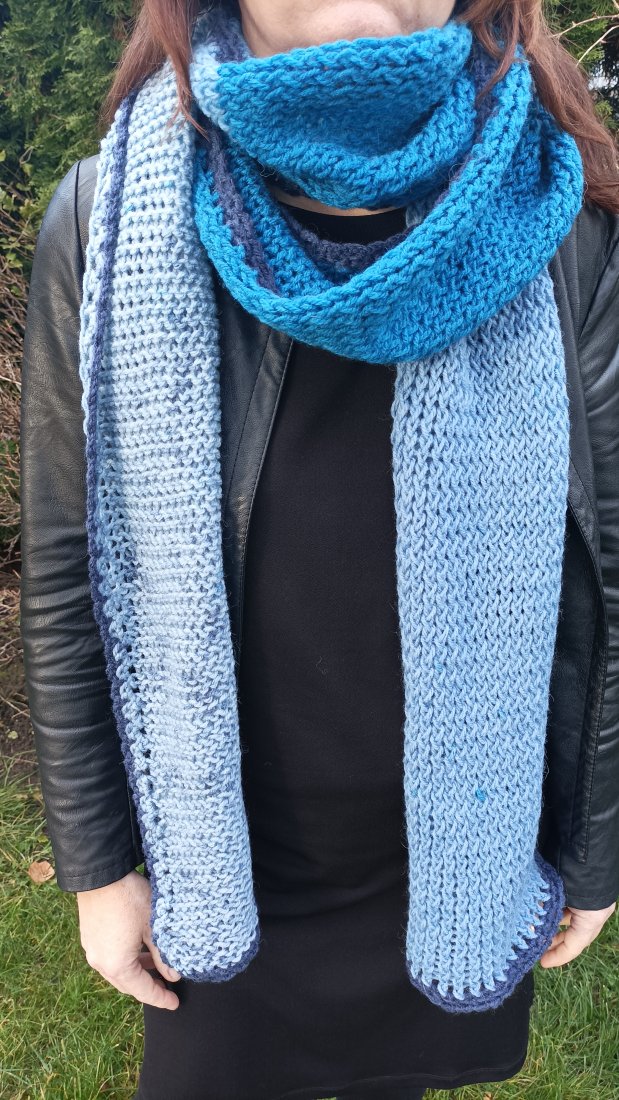 Bardzo długi szal wykonany na szydełku i obręczy dziewiarskiej z włóczki akrylowej z domieszką wełny w pięknych odcieniach niebieskiego.. Idealny na jesień i zimę. Ciekawie prezentuje się zarówno ze skórzaną kurtką, jak i ciepłym, zimowym płaszczem.