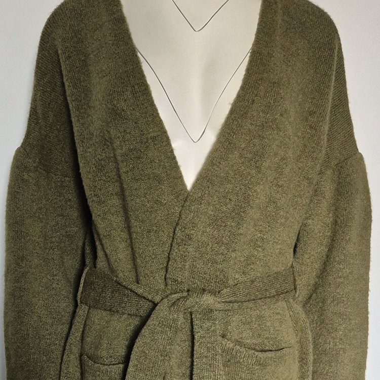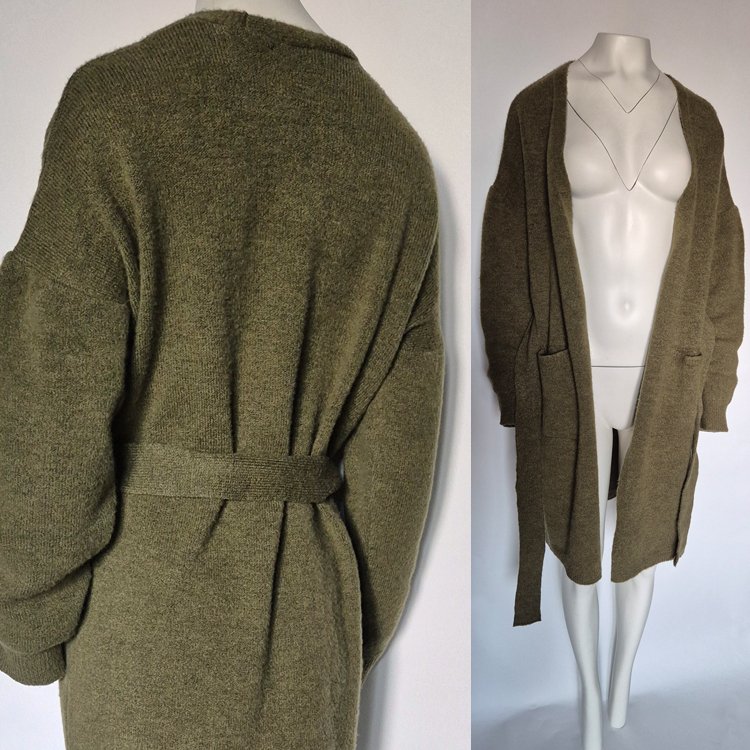 Tagi: #dłuższy sweter, #khaki kardigan, #narzutka, #wiązany sweter