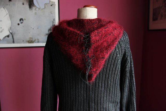 DŁUGI DWUKOLOROWY SWETER Z KAPTUREM, WYKOŃCZONY SKÓRZANYMI RZEMYKAMI,MOHER,BAWEŁNA,AKRYL