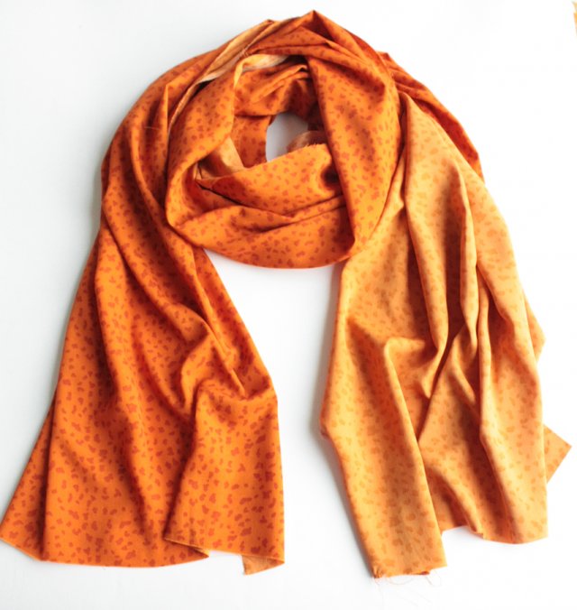 Duży szal w cętki w odcieniach ciepłego pomarańczu. Szal po lewej stronie jest o dwa tony jaśniejszy. Materiał to prawdopodobnie wiskoza.