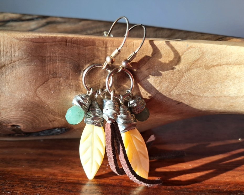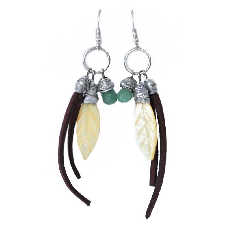 Listki wyrzeźbione w macicy perłowej, fasetowane krople zielonego jadeitu oraz zamszowe rzemienie ze skóry naturalnej