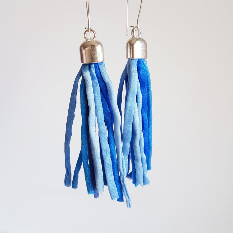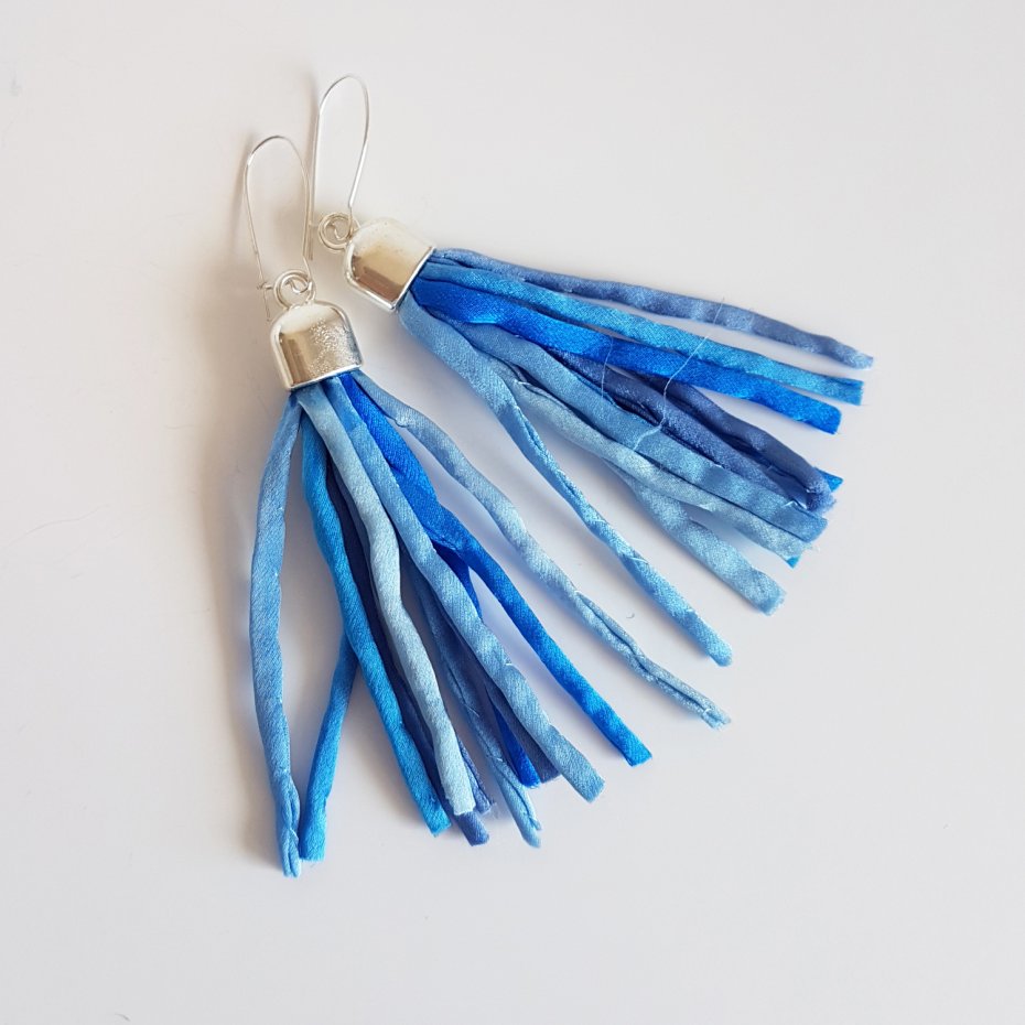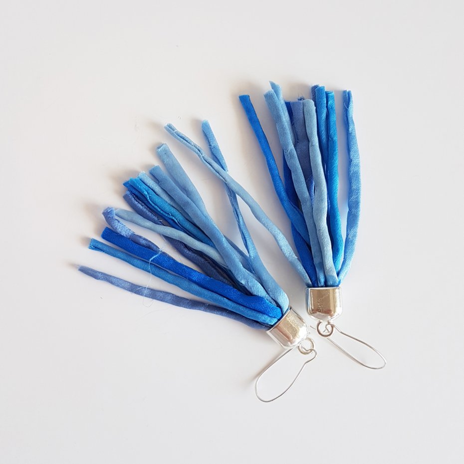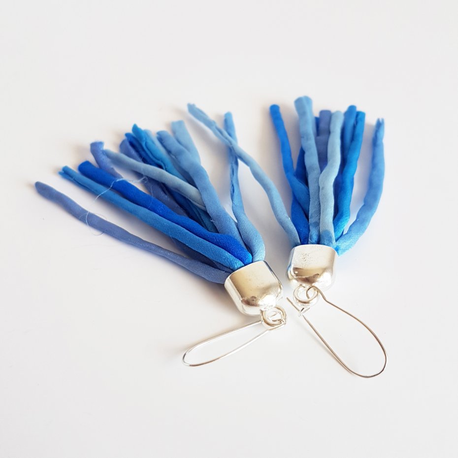Długie, malowane ręcznie, jedwabne kolczyki składające się ze zszywanych ręcznie jedwabnych ruloników. Efektowne w noszeniu przez swą niepowtarzalność .Niezwykle lekkie i dekoracyjne. Jedwab w odcieniach koloru niebieskiego i błękitnego. Ruloniki wklejone są w lekką, akrylową końcówkę w kolorze srebrnym. Do kolczyków dołączone są 3 długości bigli, które będzie można samemu zmieniać. Kolczyki zapakowane w woreczek lub pudełeczko.