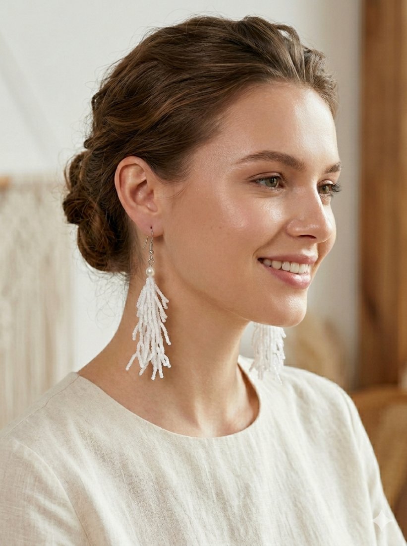 Te wyjątkowe kolczyki chwosty zostały wykonane z setek drobnych, szklanych koralików w kolorze czystej bieli, które układają się w kaskadową, organiczną formę przypominającą koralowiec. Całość wieńczy elegancka, kremowa perła, nadając biżuterii luksusowego wykończenia.