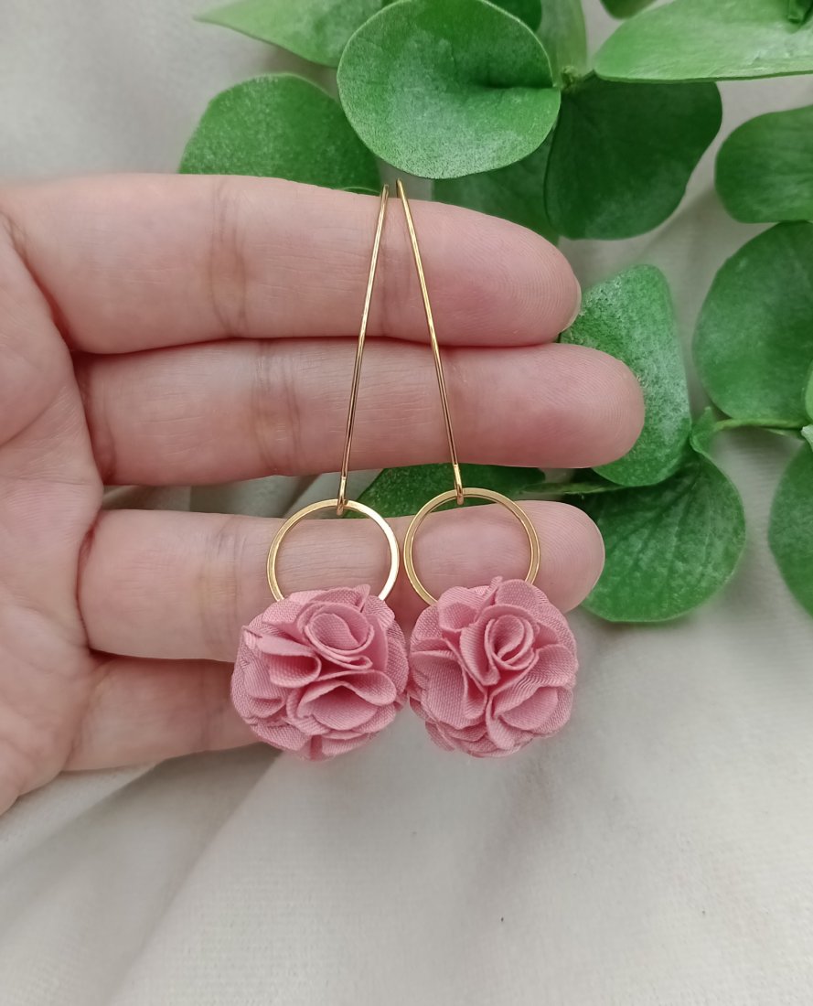 Kolczyki wykonane ręcznie, z wiskozy formowanej w płatki kwiatów w pięknym zgaszonym odcieniu różu.