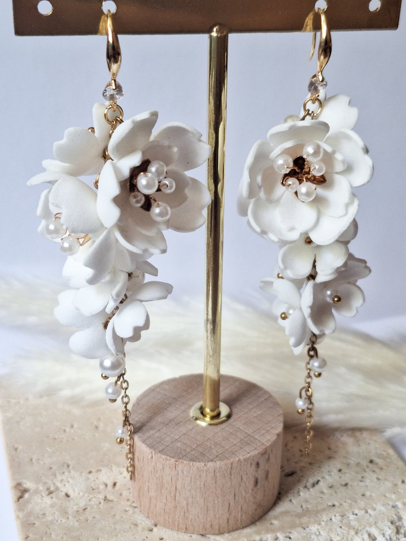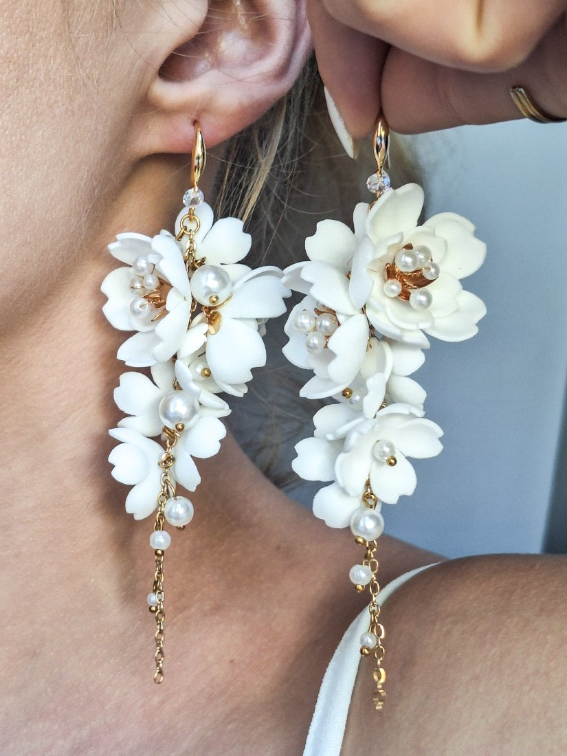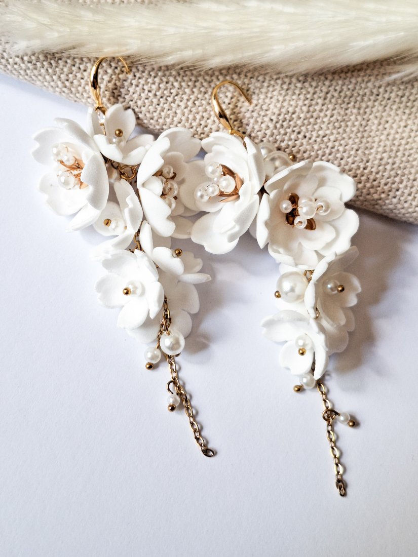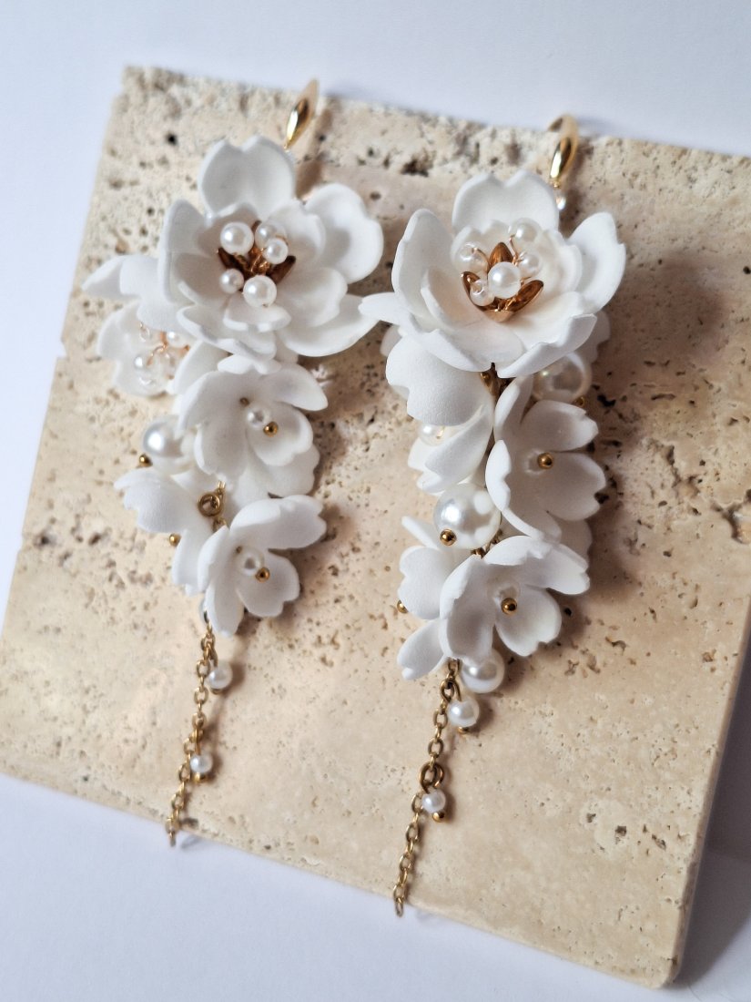 Dodaj romantycznego uroku swojej stylizacji dzięki wyjątkowym, ręcznie robionym kolczykom. Delikatne, białe kwiaty zostały misternie uformowane, by przypominać subtelne płatki wiosennych kwiatów, a całość uzupełniają eleganckie perełki i złocone elementy.