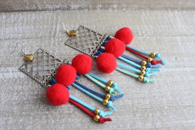 Długie boho kolczyki. Kolczyki wykonane z kolorowych ekorzemieni: niebieski, turkusowy, miętowy, czerwony, czerwonych pomponów, niebieskich i turkusowych akrylowych kolców oraz metalowych elementów w kolorze srebrnym i złotym. Całkowita długość kolczyków 13 cm, szerokość 3,5cm.