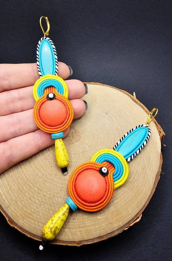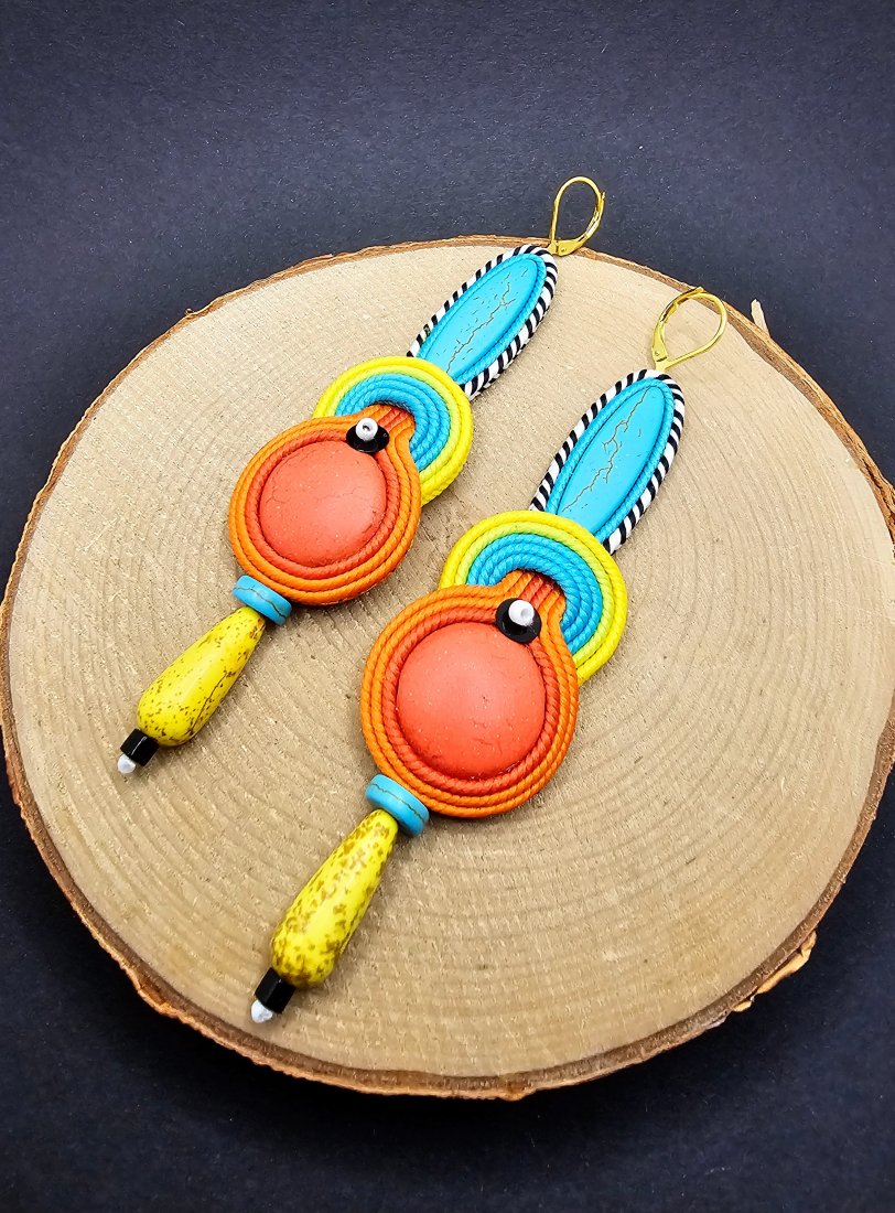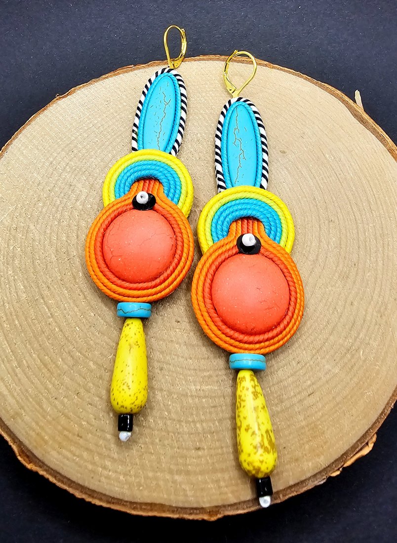 Turkusowy i pomarańczowy howlit otoczony polskimi sznurkami sutasz w żywych, mocnych kolorach przełamanych czarno-białym sznurkiem. Dół kolczyków zakończony kamieniami w kształcie dysku i kropli. Kolczyki zawieszone na biglach angielskich w kolorze złotym.