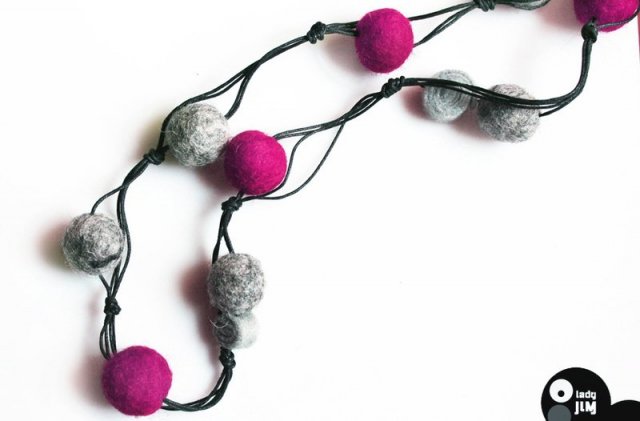 Bardzo lekkie korale z kul z filcu i filcowych elementów. Filcowe kule szare i fuksja. Niepowtarzalne i przyciągające uwagę.
