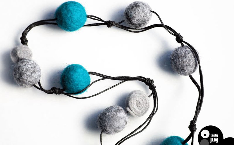 Bardzo lekkie korale z kul z filcu i filcowych elementów. Filcowe kule szare i turkusowe. Niepowtarzalne i przyciągające uwagę.