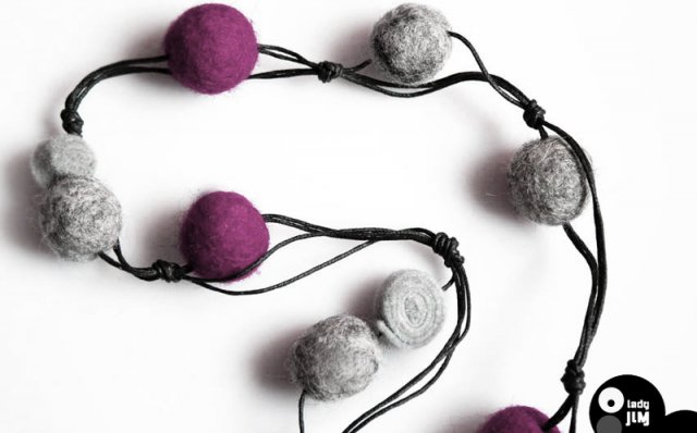 Bardzo lekkie korale z kul z filcu i filcowych elementów. Filcowe kule szare i wrzos. Niepowtarzalne i przyciągające uwagę.