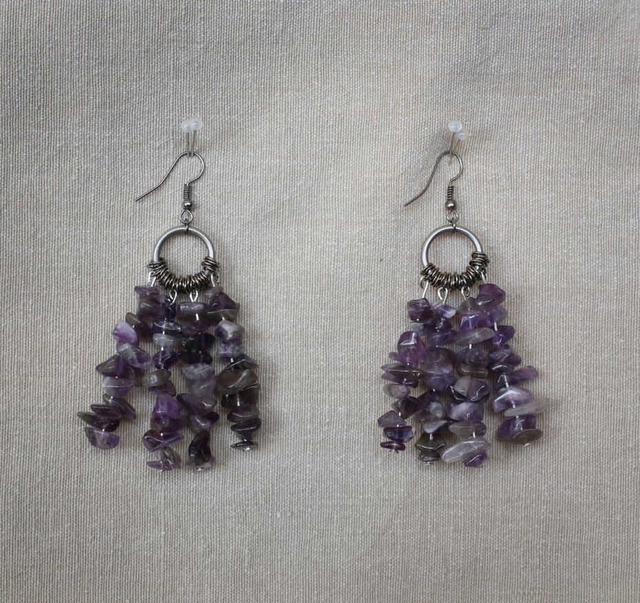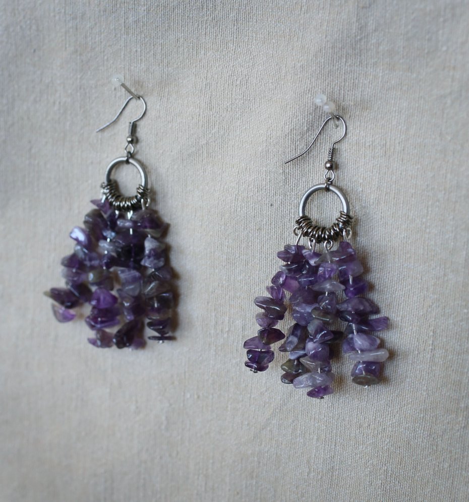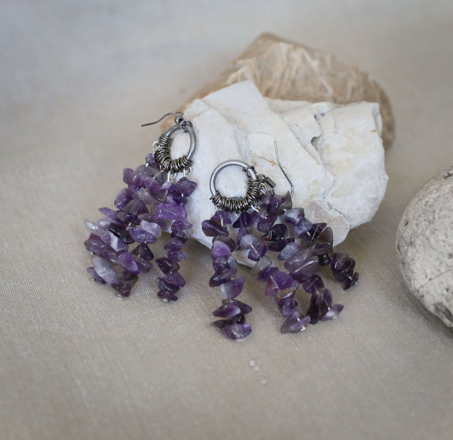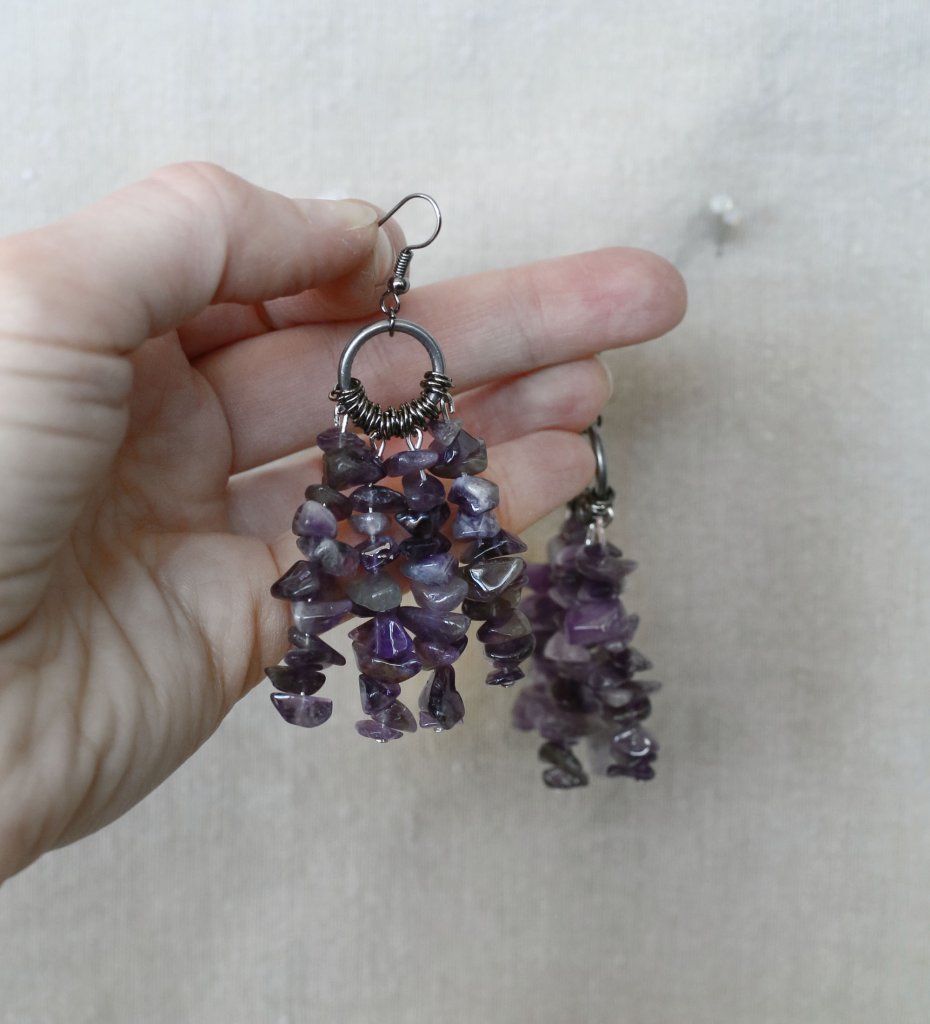 Kolczyki wiszące, w stylu boho, wykonane z ametystowych koralików w tonacji fioletowej. Bigle ze stali w kolorze antracytu.