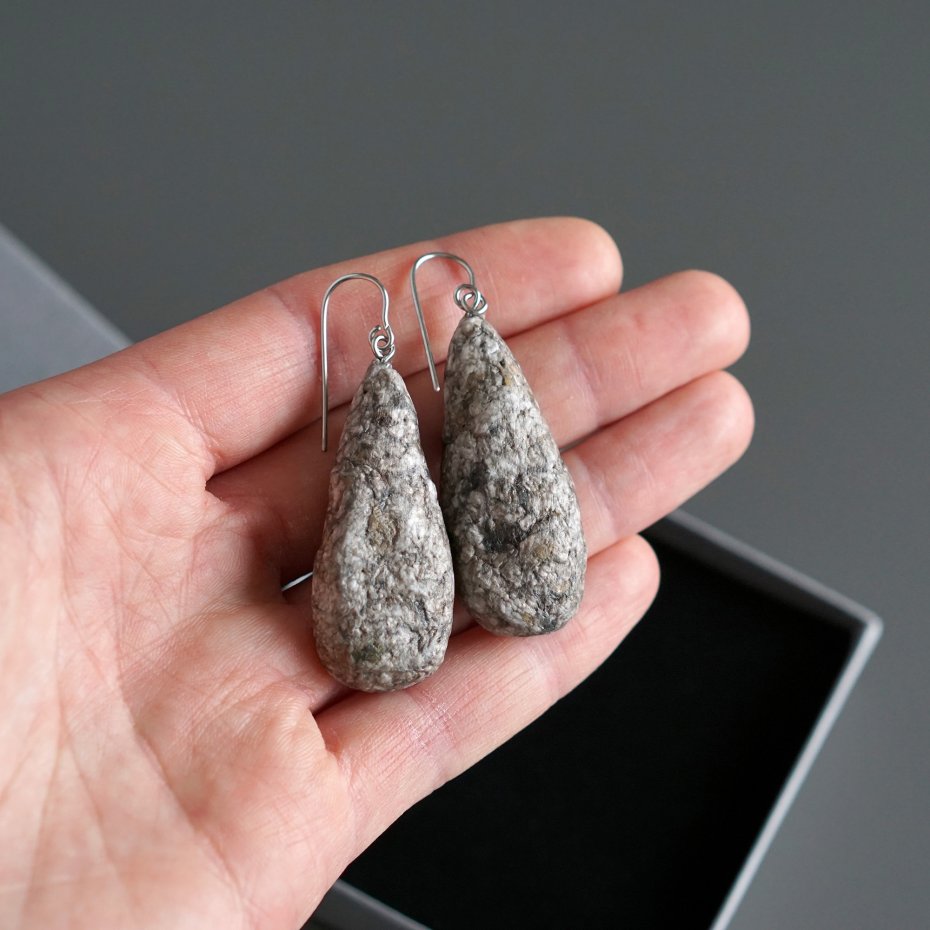 Długie wiszące kolczyki z masy papierowej, ręcznie formowane w kształt surowych, kamiennych sopli.