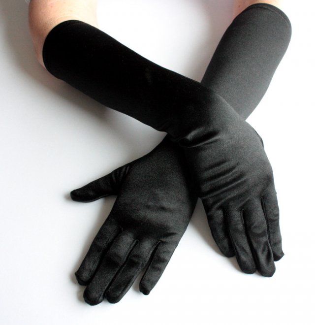 Długie, eleganckie, czarne rękawiczki z subtelnym połyskiem.