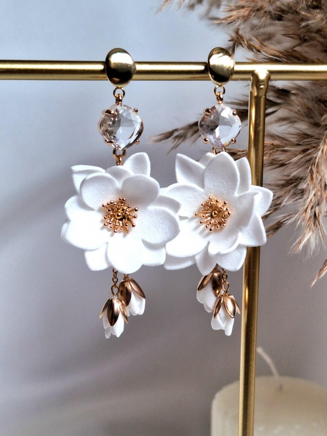 Długie wiszące kolczyki kwiaty w białym kolorze.