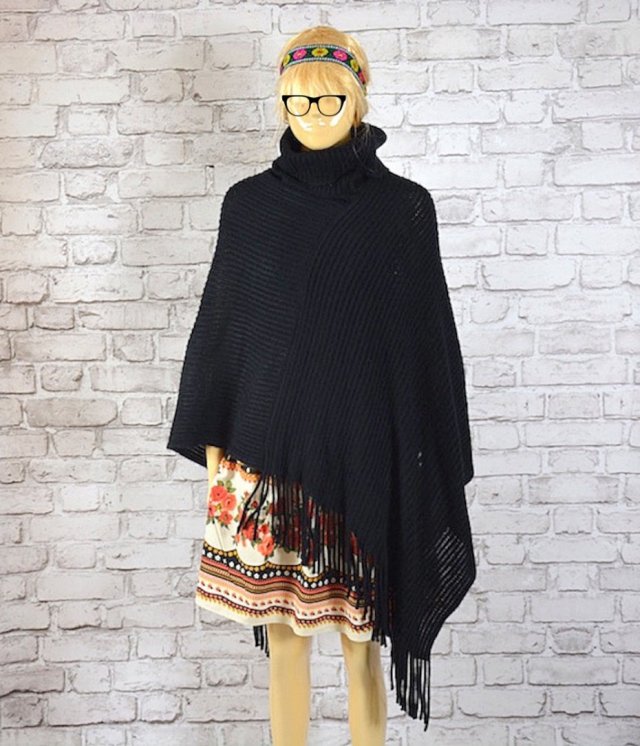 Ciepłe , czarne dłuższe asymteryczne poncho z frędzlami i golfem, wykonane z grubszej dzianiny o prążkowanej fakturze.