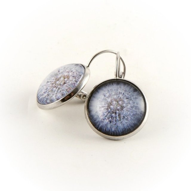Śliczne, delikatne kolczyki " Dmuchawce", wykonane są na podstawie grafiki przedstawiającej dmuchawiec. Grafika znajduje się za wypukłym szkłem, oprawiona w bazę w kolorze srebrnym.