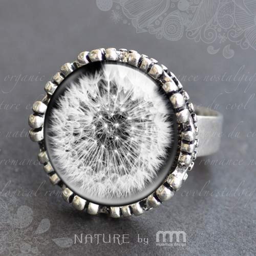 Pierścionek Dmuchawiec to bardzo kobiece i malutkie dzieło sztuki, które łączy nowoczesność z odrobiną antycznego powiewu. Obrazek pod szkiełkiem to autorska fotografia. Pierścionek jest regulowany, można dopasować do palca.