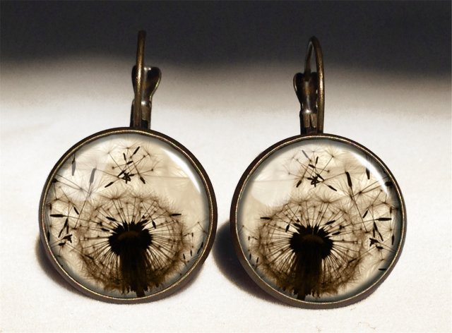 Ręcznie robione kolczyki wiszące z wysokiej jakości grafiką pokrytą wypukłym, powiększającym szkiełkiem.