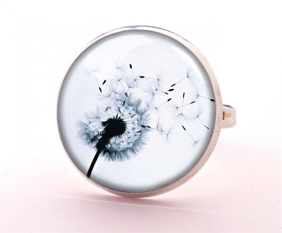 Ręcznie robiony regulowany pierścionek z wysokiej jakości grafiką pokrytą wypukłym, powiększającym szkiełkiem.