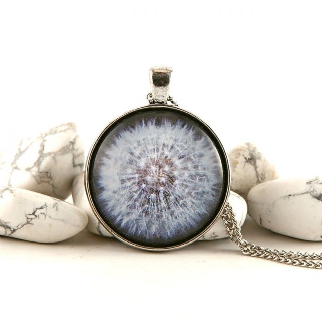 Wisiorek "Dmuchawiec" jest wykonany na podstawie grafiki z dmuchawcem, która znajduje się za wypukłym, okrągłym szkłem.