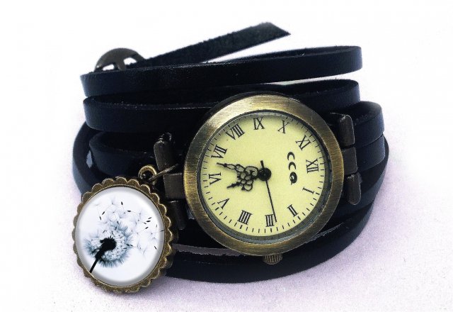 Zegarek ze skórzanym paskiem kilkakrotnie zakręcanym na ręku z ręcznie robioną zawieszką (kaboszonem).