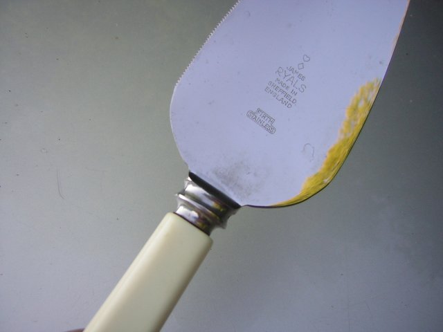 Elegancka i praktyczna Łopatka do ciasta. Sygnowana JAMES RYALS Made in Sheffield England FIRTH STAINLESS. Ostrze łopatki szlachetnie stalowe, z jednej strony dodatkowo z ząbkami. Rączka ze szlachetnie wykonanej masy plasticzanej w kolorze kości słoniowej. Wygodna, poręczna, praktyczna...