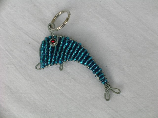 Ręcznie koralikowany na druciku delfin-breloczek. Metal, urok i świetlista turkusowość. 7 x 4 cm. Stan zachowania bardzo dobry.
