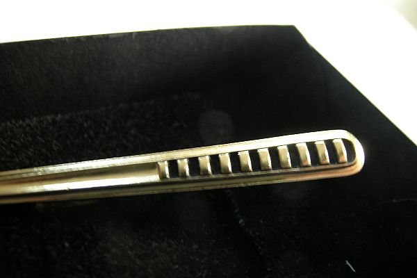 Metalowa elegancka spinka do krawatu. Oryginał z lat 70-tych. W kolorze mosiądzu, ozdobnie ryflowana. Długość 5,5 cm. W pudełku - gotowa na miły prezent :)