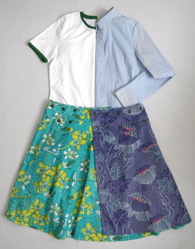 jedna strona jest w kolorze kobaltowym i szaro gołębim oraz ma czerwone akcenty. Druga strona w kolorze morskiej zieleni a na niej limonkowe kwiaty i kolibry. Fason rozszerzany, zapinana na napy na szerokim pasie.