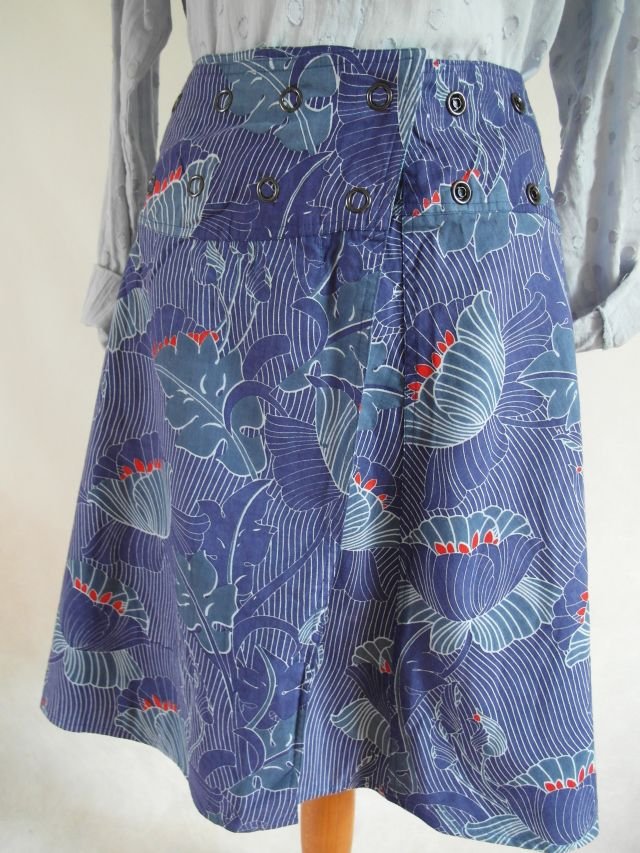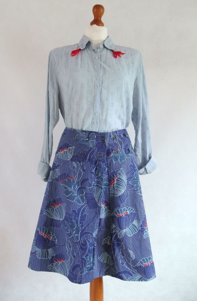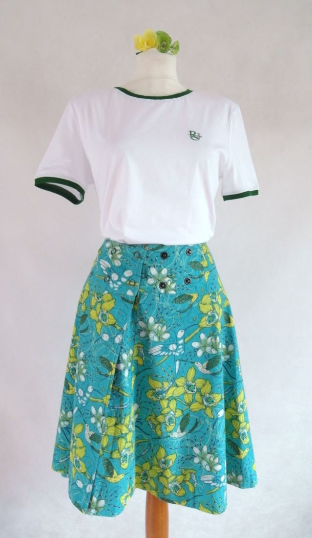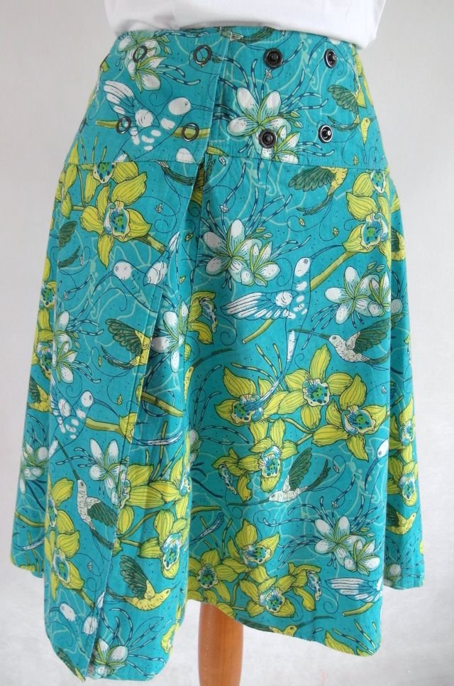 jedna strona jest w kolorze kobaltowym i szaro gołębim oraz ma czerwone akcenty. Druga strona w kolorze morskiej zieleni a na niej limonkowe kwiaty i kolibry. Fason rozszerzany, zapinana na napy na szerokim pasie.