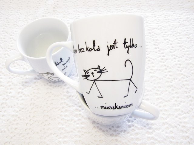 Witaj mój przyszły użytkowniku. Jestem kubkiem o pojemności 300 ml, na którym pojawił się kociak, malowany ręcznie, farbami trwałymi do ceramiki.