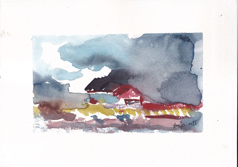 Delikatna akwarela, w której miękkie plamy koloru układają się w impresję pejzażową — jak wspomnienie mglistego poranka lub chwilę po ulewie. Ciepłe, żółte światło przebija się przez chłodne szarości i fiolety, tworząc wrażenie ulotności i spokoju. Kompozycja, choć oszczędna, niesie w sobie głębię atmosfery i emocji — balansując między abstrakcją a sugestią natury.