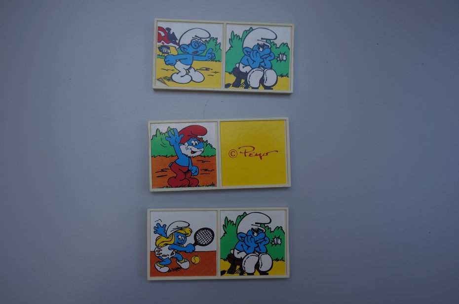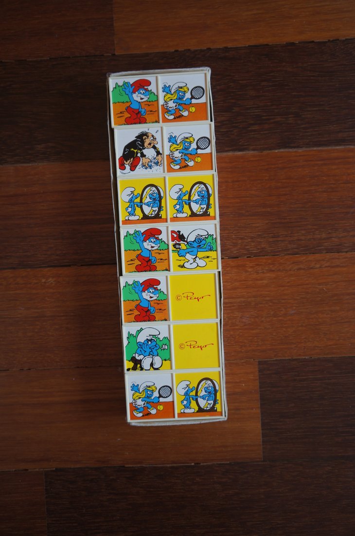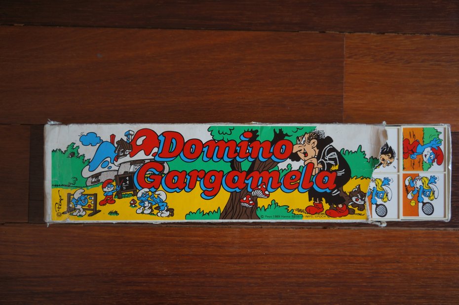 Zestaw domina obrazkowego pt. “Domino Gargamela", inspirowany bajką “Smerfy". Wyprodukowane na licencji Peyo. Vintage, wczesne lata 90 XX w. Przedmiot kolekcjonerski, często pochodzący z czasów PRL. Stan opakowania gry widoczny jest na zdjęciach. Pudełko nosi wyraźne ślady użytkowania. Klocki w stanie bardzo dobry. Gra jest kompletna - 28 klocków.