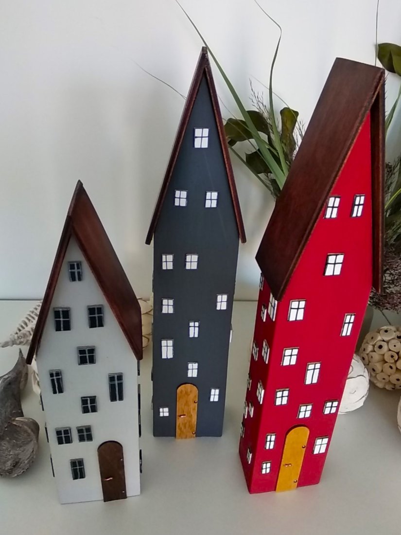 Wysokość domków: 31 cm, 30 cm, 24 cm, podstawa domków 5,5 cm x 4 cm."