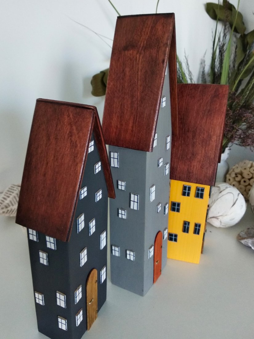 Zestaw ręcznie wykonanych domków o smukłej, strzelistej formie, malowanych farbą akrylową w kontrastowych, wyrazistych kolorach. Bejcowane i lakierowane dachy podkreślają naturalny charakter drewna, a liczne okienka z każdej strony nadają całości lekkości i dopracowanego wyglądu.