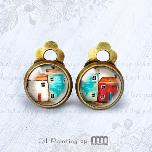Chat Noir klipsy to bardzo kobiece i malutkie dzieła sztuki, które łączą nowoczesność z odrobiną antycznego powiewu. Obrazki pod szkiełkiem to miniatura autorskiego obrazu. Klipsy pasują świetnie do naszyjnika DOMKI NADMORSKIE dostępnego w osobnej ofercie.