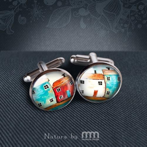 Spinki do mankietów Domki Nadmorskie to malutkie dzieła sztuki, które łączą nowoczesność z odrobiną antycznego powiewu. Obrazki pod szkiełkiem to obraz mojego autorstwa. Idealny prezent dla Pana od Pani ;), pasujący także do kolczyków z tym samym motywem.