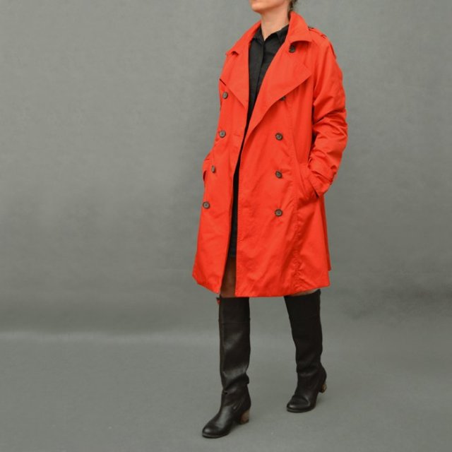 Trencz w intensywnej czerwieni. Materiał z leciutkim połyskiem, ładniejszy niż na zdjęciach bo jest prześwietlony. Na podszewce. Wiązany w talii.